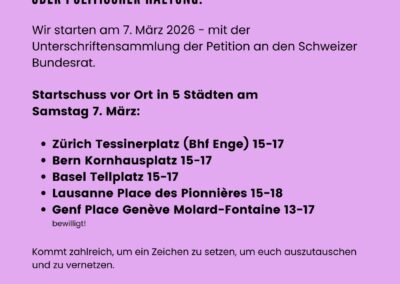 - Stände in 5 Städte (Bern, Zürich, Basel, Lausanne, Genf) um Unterschreibungen zu sammeln für eine Petition gegen Gewalt als Kriegeswaffe