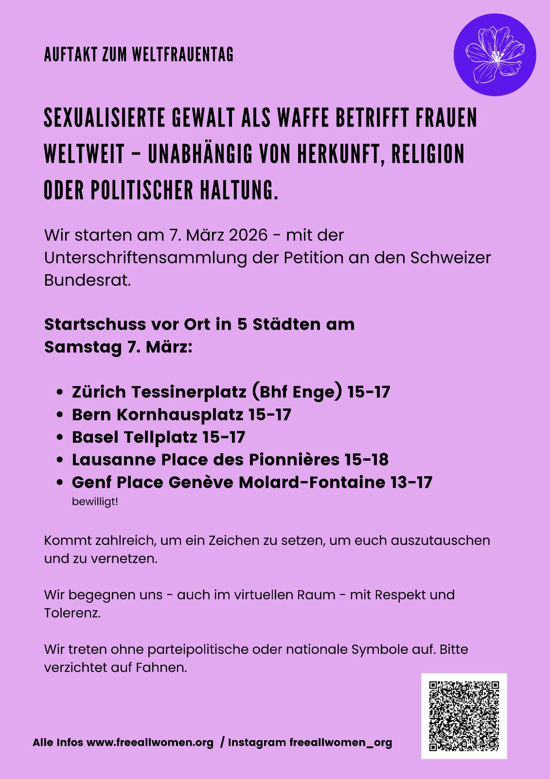 - Tables in 5 cities (Bern, Zurich, Basel, Lausanne, Geneva) to collect signatures for a petition against sexual violence as a weapon of war